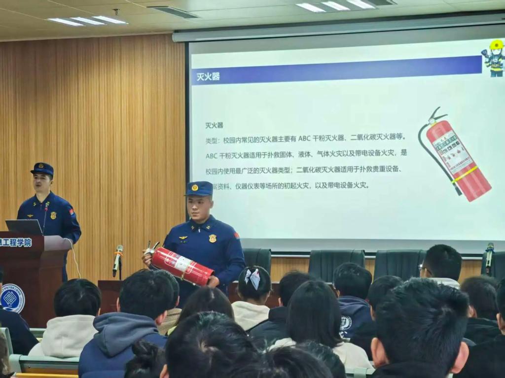 接着,腾飞路消防救援站消防员讲解火灾成因、发展阶段及不同类型火灾特点,演示各类灭火器使用方法,同时针对校园电气火灾隐患给出预防建议。他特别强调了校园重点区域的防火要求,在学生宿舍区域:严禁使用电炉、电饭锅等违规大功率电器;在教学实验场所:严格遵守实验室安全操作规程,规范管理、使用易燃易爆危险化学品;实验结束后及时切断电源、气源、火源。在讲解灭火器时,消防员指导师生分组进行灭火器实操训练,通过“手把手”的指导,确保师生的动作规范、准确。实操训练结束后,消防员针对操作细节进行复盘讲评,切实巩固教学成效。