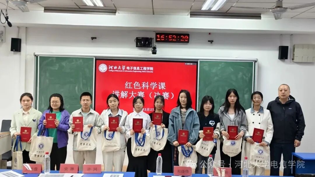为纪念中国人民抗日战争暨世界反法西斯战争胜利80周年,传承革命先辈廉洁奉公、艰苦奋斗、科学救国的红色品格,我校于2025年12月正式启动第二届红色科学课讲解大赛。本次大赛由校团委与电子信息工程学院联合主办,以抗战精神铸风骨,科学报国勇争先为主题,将红色基因、科学精神与廉洁修身教育深度融入课堂实践,引导青年学生从红色历史中汲取力量、在科学探索中坚守初心、于时代征程中涵养清风正气。决赛于2026年3月27日顺利举办。大赛特邀保定市一中分校原校长、莲池区政府督学和晓倩,河北大学校团委教师许珂,河北大学赴新疆生产建设兵团兴新职业技术学院援疆教师赵丽佳,电子信息工程学院团委教师刘志佳、团委副书记宋琳组成专业评审团。电子信息工程学院党委副书记杜凯华出席活动并致辞,向全体参赛选手、指导老师及评审嘉宾表示诚挚欢迎与衷心感谢。
