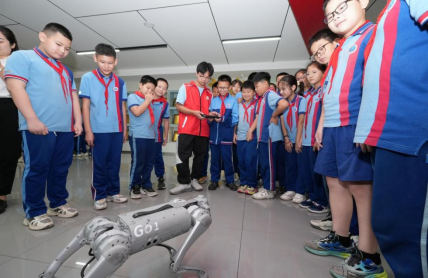 一楼大厅,在师生党员的指导下,机器人展示互动环节掀起小高潮。NAO机器人灵活的关节活动、宇数机器狗的传感器布局,让学生们近距离观察科技原理。大家亲手操控Alpha机器人完成指定动作,直观感受运动控制逻辑。RoboMaster机器人的设计故事分享后,学生们踊跃提出“如何优化机器人竞技功能”等问题,探索欲与创新思维被充分激发。